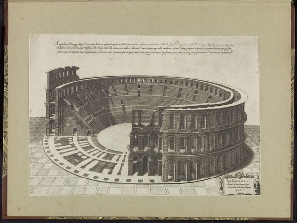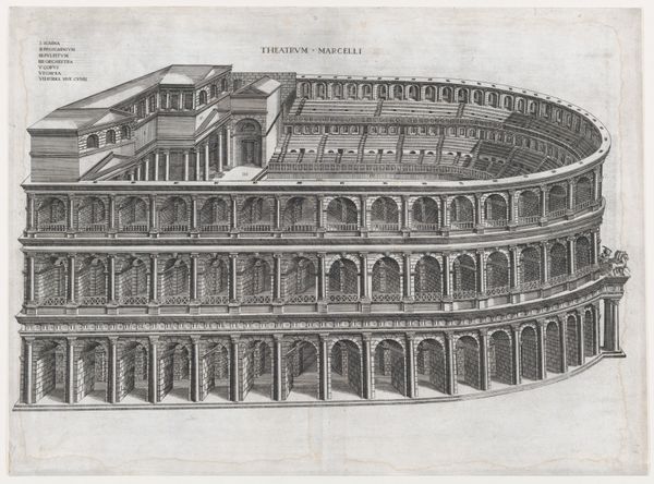 Curator: This print, titled Speculum Romanae Magnificentiae: Amphiteathrum Castrense, was created around 1560. The artist is anonymous, but the work is currently held at the Metropolitan Museum of Art. It's an engraving, a precise rendering of ancient architecture. Editor: There's such an air of decay and the romantic ruin in this image. It looks like the architectural drawing of a theatre, cutaway, yet haunting in its detail, the clouds are brooding in the background. Curator: Indeed, the ruin becomes a symbol here. Consider the socio-political context: Renaissance artists were fascinated by Roman antiquity, and such detailed architectural studies served as both documentation and, in a sense, as a reclaiming of a lost heritage. The work becomes enmeshed with ideals of civic virtue, linking back to the Renaissance artistic project, but the ruin of course represents the ephemerality of earthly things. Editor: And look at the meticulousness with which the amphitheater is rendered – each brick, each arch. There’s a palpable sense of pride in showcasing the ingenuity of Roman engineering. And of its capacity for violence. Amphitheatres are interesting spaces in terms of symbolism as much as physical reality. They become emblematic of power. Curator: Exactly! Amphitheatres as places of public gathering reflect structures of governance. Consider also the gaze directed within this image - that it both monumentalizes and critiques social order by reminding the viewer of human capacity for inflicting suffering and violence, even through something as outwardly ‘harmless’ as staged theatre. Editor: It speaks to cycles, doesn’t it? Of construction, of destruction, of rediscovery. The very act of engraving is itself interesting to the history of memory, that visual forms can be duplicated and disseminated so widely, echoing or rewriting history over and over. I suppose my point being, this is an architectural image, but not about that in a simple way. Curator: I appreciate how you brought in ideas of both social critique and human endeavor when responding to this. It reminds me of how the study of antiquity can both glorify and destabilize. Editor: Agreed. Images carry their past within them, and through each viewing they shape our perceptions. Curator: Beautifully said.