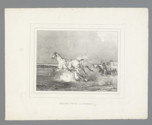 Bernard Édouard Swebach created this print, “Ruiter wordt van zijn paard geslingerd,” likely during the first half of the 19th century. Swebach, born at the cusp of the 19th century, found himself amid a period of significant social change following the French Revolution. Here, we witness a dramatic tumble as a rider is thrown from his horse during a hunt. The scene, charged with dynamic energy, suggests a world where the thrill of the chase and the display of equestrian skill were paramount, reflecting the leisure pursuits of the upper classes. Yet, the vulnerability of the rider, caught mid-fall, disrupts this image of aristocratic dominance. The print invites us to consider how the spectacle of the hunt, often associated with masculine prowess and social status, could also be a stage for unexpected mishaps, momentarily leveling the playing field. The image serves as a reminder that beneath the veneer of control and privilege, there often lies the potential for chaos. This scene captures not just a moment of physical disruption, but a glimpse into the precariousness of social and personal identity.