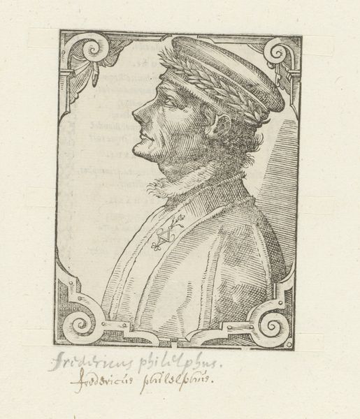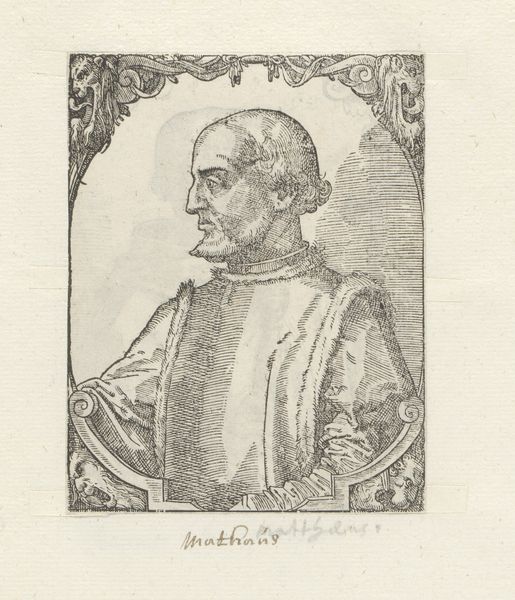 Curator: Here we have a striking engraving, "Portret van Vitellocius Vitellius," created sometime between 1549 and 1575 by an anonymous artist. It is a wonderful example of the Italian Renaissance style rendered in simple lines. Editor: The first thing that strikes me is the directness of his gaze, even though it’s a profile. The strong lines give a very intense feel for what otherwise looks like a solemn fellow! Curator: Yes, this portrait exists within a fascinating historical context. Mannerism flourished during a time of religious and political upheaval; the style is marked by distortion, exaggerated forms, and intense emotion, arguably mirroring the anxieties of the era. Editor: That intense gaze and stern facial structure do make one consider ideas of authority, or even a rigidity enforced by societal role. Do you feel the floral ornament around the border adds a certain delicacy? Or, perhaps the sharp lines, like in his cheek and brow, represent control attempting to contain something wilder? Curator: The use of line here is incredible. Notice how the engraver varies the thickness and spacing of the lines to create subtle tonal variations and suggest depth and volume. We might interpret this print through the lens of class and privilege – look at the ornamentation itself, but more profoundly, examine the very act of commissioning and creating such an artwork. It is not the portrait of the common man, but it immortalizes a member of the elites, perpetuating specific power structures. Editor: Precisely. And thinking of cultural memory, these images acted as potent visual reminders of lineage and legacy for powerful families of that period. Looking at similar portraits, it's hard not to see the echo of Roman coin effigies. These kinds of artworks reinforce a deliberate construction of identity. Curator: Considering the context of gender, who was permitted visibility at that moment? If he is named Vitellius, might that call to mind that earlier emperor, particularly in contrast to someone such as Agrippina? And, in either case, we would do well to understand both portraits not as fact, but instead as something strategically created. Editor: Yes, I completely agree. Curator: Reflecting on it all, the piece embodies more than a historical likeness; it is an artifact steeped in the power dynamics of its time. Editor: Definitely food for thought! This piece highlights just how charged simple iconography can be!