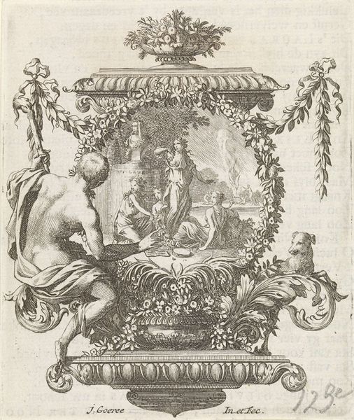 Curator: This artwork, an etching on paper, is entitled *Chimneys in the Italian Manner*. Created around 1665 by Jean Le Pautre, it's now held at the Art Institute of Chicago. Editor: Immediately, I'm struck by the sheer theatricality of it! The density of the detail is just breathtaking. It’s baroque excess personified, right down to the muscle-bound figures seemingly straining to hold up the mantel. Curator: Precisely. Notice how the caryatids serve not just as architectural supports but also embody the classical ideal of strength and stoicism. Their presence suggests a continuity with ancient Roman values, something highly prized in the 17th century. It really evokes this sense of lasting legacy. Editor: Absolutely, it's referencing classical forms but with this amplified, almost bombastic quality typical of the Baroque era. All those embellishments—the laurel wreaths, the goddess atop with her trumpet. What’s she a symbol of exactly? Curator: She most likely is meant to invoke Fame or Victory, announcing the glory of the household or the achievements it represents. That combination of the idealized figure of fame combined with the specific architectural details would elevate the very idea of ‘home’ itself. Editor: And what's really intriguing to me is the texture. The etcher, Le Pautre, has used such a refined approach to hatching, so delicate that it gives depth and definition and enhances the sense of movement to the entire composition. Curator: Consider also, that designs for decorative elements, like these fireplaces, disseminated cultural trends. They show not just what could be afforded but what narratives the owner desired to embody. Chimneys of this manner communicate prosperity and knowledge. Editor: Well, it certainly declares affluence! Thinking about Le Pautre’s original audience, can you imagine flipping through a book of prints like these and dreaming of incorporating this sort of grandiose flourish into your own home? Curator: The drawing provides an insight into a period where art, architecture, and power coalesced so emphatically. Visual symbols were instruments to relay both overt and subtle information about their owners, establishing social status and aspiration. Editor: Seeing the convergence of design and culture, this work embodies so much! Curator: It shows that through form and imagery, ideas take solid shape.