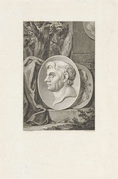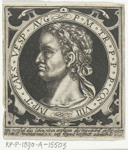 Curator: Here we have Jan Caspar Philips's 1746 engraving, "Portret van keizer Titus," from the Rijksmuseum collection. The texture almost vibrates with fine lines! What leaps out at you? Editor: It feels… stern, doesn’t it? Very classical in its restraint. The crisp lines and limited tonal range give it a monumental feel, despite its small size. It's like looking at an ancient coin blown up to poster size. Curator: Absolutely. Engravings like this portrait were critical for disseminating imagery and reinforcing power structures in the 18th century. Reproductions of rulers and important figures served as visual propaganda. It helped create a sense of authority, legacy, and connection to classical ideals. Editor: Power documented for distribution...I see what you mean about propaganda. I’m drawn to the laurel wreath though, kind of ironic, this symbol of triumph. It sits quite heavily, a rigid frame for Titus' features. Do you think it emphasizes the burdens of leadership, perhaps? Or simply idealizes the Emperor? Curator: It definitely draws on established symbolism. The laurel wreath and the inclusion of the medallions referring to 'PAX' (peace) and 'Victoria AVG', position Titus within the narrative of Roman virtue and imperial strength, continuing even centuries later to influence the depiction of leadership. It is not meant to reflect an honest burden of leadership but promote legacy through symbolism. Editor: Ah, gotcha! It's less a character study then, and more of a symbolic representation, carefully crafted for its impact. It makes me consider how the symbols of power shift over time and what endures. A picture, in every sense of the word! Curator: Precisely. This wasn't just about accurately depicting Titus's features. It was about building a visual legacy and using a relatively accessible medium for broad impact. An artwork’s significance transforms through context and the ages. Editor: Well, I look at it now with an altered mindset - no longer stern and sober - simply strategic! Thanks to Jan Caspar Philips for getting us here!