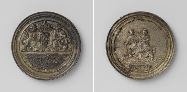 Editor: Here we have "Merchandise," a bronze relief carving created around 1590-1596 by an anonymous artist, currently housed in the Rijksmuseum. The circular form and the figures within it create an interesting contrast of sharp detail within a rounded, soft edge. What can you tell me about this work's composition? Curator: The composition hinges on the interplay of circular forms. Note how the central scene, enclosed within its circular frame, creates a world unto itself, contrasting against the stark geometry of its backdrop. Consider the distribution of figures. Do you observe a deliberate asymmetry that challenges the classical ideals of balance and harmony? Editor: I see what you mean. It's not perfectly symmetrical. What effect does that asymmetry create? Curator: The slight imbalance contributes to a dynamic tension within the composition. It disrupts a static reading and invites the eye to explore the nuances of the relationships between the figures, between figure and ground. Observe how the artist’s use of light and shadow further accentuates the texture of the bronze, almost giving it a tactile quality. What do you make of that textural emphasis? Editor: It almost makes the figures pop out. The contrast between the dark, almost blackened bronze and the highlights creates depth. It emphasizes the material quality. Curator: Precisely. The artist's manipulation of texture isn't merely decorative; it's integral to the articulation of form and space. It brings the work to life in a tangible way. Editor: I had not noticed the level of detail. This examination into the formal aspects is illuminating. Thank you. Curator: The beauty of formal analysis lies in its ability to reveal the hidden architecture of a work, enriching our understanding and appreciation.