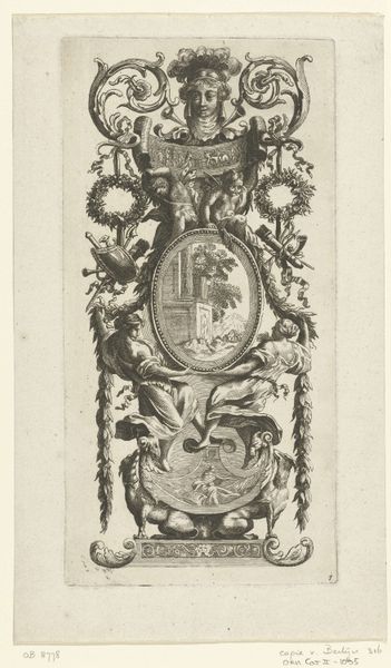 Editor: Here we have "Voetstuk met medaillon," or "Pedestal with Medallion," a drawing by Jean Charles Delafosse from 1771. It’s an engraving on paper, currently held at the Rijksmuseum. It reminds me of architectural blueprints—very precise and focused on form. What immediately strikes you when you look at this piece? Curator: Immediately, the rigor of the line takes precedence. Delafosse meticulously renders a pedestal, paying close attention to the geometry of each element. Consider the interplay between the rectangular structure and the circular medallion—it is a dialogue between rigid form and softened contour, isn't it? Editor: Yes, and the use of engraving really emphasizes those clean lines and geometric shapes. Is there anything symbolic in this piece or anything beyond its geometry that the eye is drawn to? Curator: The very nature of the pedestal is symbolic. What does a pedestal do? It elevates. And in this elevation, the artist brings our attention to the structure. But beyond the overall form, look at the decorative wreaths; they soften what could otherwise be seen as too severe a geometric form. We might think of semiotics here—the wreath symbolizing victory or honor, yet confined within the larger architectural structure. Editor: That makes me consider the tension between ornamentation and the underlying geometric forms. Thank you, I see it so differently now. Curator: The pleasure lies in seeing how these formal elements synthesize to give the work its unique, compelling character.