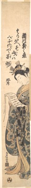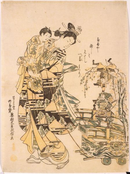 Editor: This print is called "Children with Toys (New Year's Greeting)" by Torii Kiyohiro. It's hard to date it exactly, but the artist lived in the 18th century. I'm struck by how much detail is packed into such a small space. What do you make of it? Curator: This print speaks volumes about the performative nature of identity and social roles in 18th-century Japan. What do you notice about the children's clothing and props? Editor: They seem very stylized, like they're putting on a show. The one standing has some arrows, and the other has a fan. Curator: Precisely. These aren't just kids playing; they're enacting rituals, possibly tied to New Year's celebrations and the warding off of evil. The print highlights how even children are embedded in systems of cultural performance. Editor: So, it's not just a cute scene but a reflection of societal expectations? Curator: Exactly! It underscores how identities are shaped and reinforced through social practices from a very young age. Editor: I never would have considered how the image of childhood could be read through a cultural lens. Thanks! Curator: It is through questioning the apparent that we gain insight into the underlying structures that perpetuate these roles.