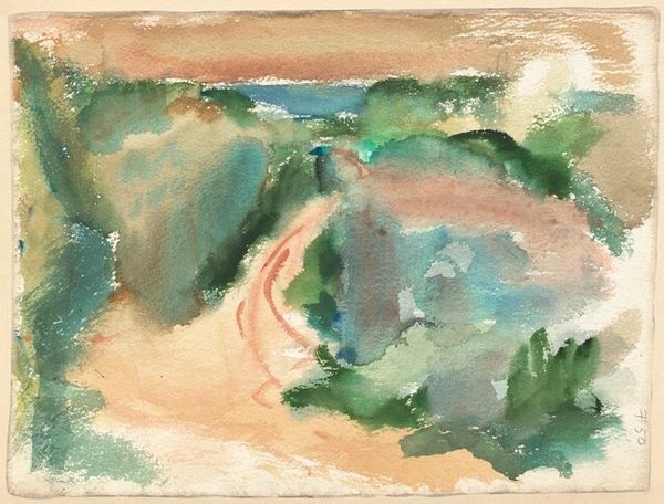 Editor: This is "Landscape, Coronado, California" by Denman Waldo Ross, a watercolor painting. The colors are so muted, it almost feels like a memory. What stands out to you? Curator: The layering of colors creates a dreamlike quality, echoing early modernist desires to capture subjective experience. Note how the trees, though static, vibrate with implied movement. The blue river divides the painting, setting up a subconscious tension. What does this division evoke for you? Editor: It feels like a separation, maybe between the real and the ideal? Curator: Precisely. Ross subtly plays with the viewer's perception, hinting at a deeper psychological landscape. The repetition of forms is also very meaningful, as it is associated with memory and continuity. Editor: So, the painting is not just a landscape, but also a map of the mind? Curator: Indeed. It makes us think about how we perceive and remember places, and the emotional baggage we carry with us. Editor: That really changes how I see the painting. Thanks!