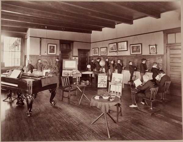 Editor: This photograph, titled "Defectives, Feeble-minded: United States. Massachusetts. Waverly. School for Feeble-minded: Massachusetts School for the Feeble-Minded.: Color Lesson." by William A. Webster, shows a classroom, seemingly in the late 19th or early 20th century. The sepia tone lends a somber, institutional feel. What do you see in terms of its visual composition? Curator: The composition is quite formal and hierarchical. Note the strong horizontal lines created by the desks and the windows, balanced by the verticality of the doorway and the students themselves. The light, entering from the windows, draws the eye but remains diffuse, creating a sense of uniformity rather than highlighting individual subjects. Editor: The uniformity feels unsettling, given the title. The arrangement of objects and people is clearly deliberate. Curator: Precisely. Observe the repetition of forms—the desks, the animal figures—and the way this repetition underscores the institutional nature of the scene. The absence of a clear focal point further emphasizes the systematic control. What does this suggest to you? Editor: I hadn't considered that. It’s a very controlled composition, which enhances the rigid atmosphere. Thanks for pointing out the formal elements and how they construct meaning. Curator: Indeed. By analyzing the form, we gain insight into the intended message.