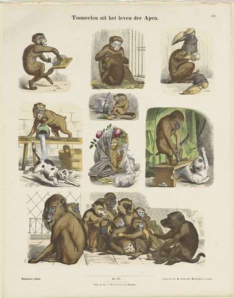This print, titled 'Natura artis magistra' by De Ruyter & Meijer, presents a tableau of primates, each framed within its own vignette, rendered with delicate lines and muted earth tones. The composition strikes a balance between scientific illustration and a more sentimental, almost anthropomorphic depiction of the animals. The arrangement of the primates, each contained within a defined space, hints at a structuralist approach. By isolating and categorizing these species, the print creates a semiotic system where each image functions as a signifier. The title, which translates to "Nature is the teacher of art," sets up a dialectic between observation and representation. The choice of medium, likely etching or lithography, allows for intricate detail and texture, drawing attention to the materiality of the print itself. Through a formal lens, the work compels us to consider how humans perceive, classify, and ultimately represent the natural world through art. It challenges fixed meanings, and instead invites ongoing dialogue.