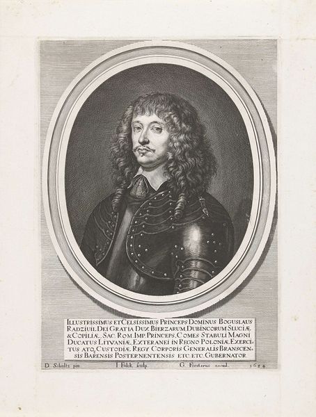 Curator: This is a print depicting James Graham, Marquis of Montrose, Earl of Kingcairne, created between 1620 and 1660 by Adriaen Matham. Editor: It's a very formal portrait. The detail in the armour is amazing. It feels like a powerful, authoritative image, almost imposing. How do you interpret this work, considering its historical context? Curator: Well, let's consider what’s missing. Where are the overt symbols of military victory we might expect given the inscription indicating that James Graham was Lieutenant Governour and Captain General for His Majesty? Instead, the image seems preoccupied with projecting status and nobility through symbolic display. Why do you think Matham chose this approach? Editor: Perhaps Matham aimed to depict Montrose not just as a military leader, but as a nobleman rooted in the land and class structure? A man divinely appointed, rather than merely accomplished on the battlefield? Curator: Precisely! The inclusion of the heraldic symbols in the upper corners of the portrait serve as a deliberate connection to lineage and divine rights. The text accompanying his portrait underscores the various tiers and ranks that were bestowed on him. Moreover, Matham’s deliberate, almost loving rendering of his hair soften any imposing readings, suggesting that class and identity also served to humanize the sitter. How does that consideration complicate your initial reading? Editor: It shifts my perception. The portrait now seems less about individual power and more about the system that empowered him. The armor speaks of both authority and subjugation. Curator: Indeed, this portrait opens up questions about the relationship between power, identity, and representation during this period. By critically examining such portrayals, we can dissect the ways power operates through cultural production. Editor: It's fascinating to see how much a single image can reveal about the social and political landscape of its time. Curator: Exactly! These portraits aren't just records of individuals; they are records of systems.