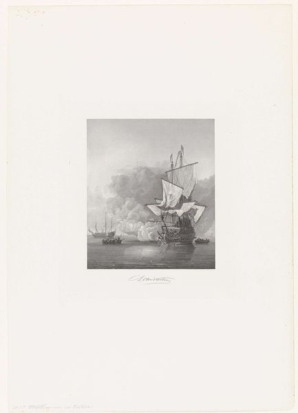 Michel Mourot made this print of herring fishing boats at sea using etching and possibly other techniques. While undated, it probably reflects Mourot's time in the Netherlands during the early 19th century. The image is a glimpse into the economic and social life of the Netherlands, where herring fishing was a major industry and cultural touchstone. The scale and detail suggest that this was a print intended for wide distribution, possibly to celebrate or promote the fishing industry. The print’s attention to the lives of working people also reflects the democratizing trends in the art world. The art market was growing, with new institutions and exhibiting societies. Artists could now produce works, such as prints, with the intention of distribution to a wider audience. By examining the print alongside archival material related to the fishing industry and exhibition records from the period, we can learn more about the social and economic context that shaped its production and reception.