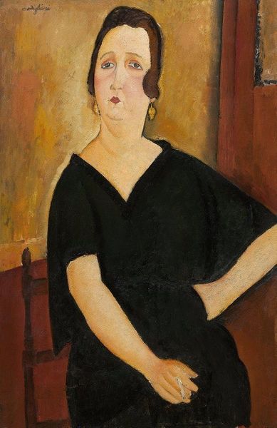 This is "Portrait of Paulette Jourdain" by Amedeo Modigliani. The eye is immediately drawn to the elongated form of the sitter, a striking feature that defines the painting's visual character. Her stretched neck and face, rendered with smooth planes, create a sense of elegance, yet also distance. The composition is structured by contrasting blocks of colour: the warm, ochre background versus the dark, solid mass of Paulette's dress. This stark contrast emphasizes the figure’s presence, while the adjacent red door adds a sense of enclosure, heightening the portrait’s psychological intensity. Modigliani's simplification of form flattens the picture plane, moving away from traditional representational depth. The emphasis on line and shape, rather than detailed modelling, reflects a broader artistic interest in abstraction. It challenges the conventional portraiture, inviting us to consider how representation itself can reshape our understanding of identity and space. Ultimately, the portrait is less about capturing likeness and more about exploring the formal possibilities of painting.