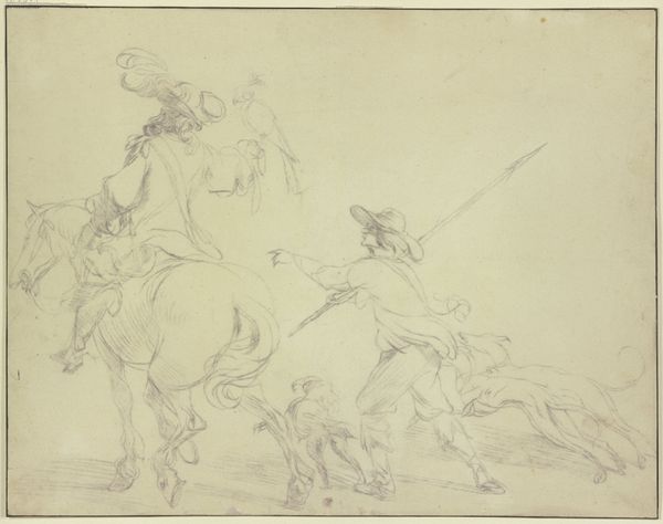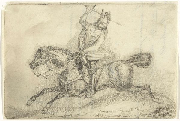 Curator: Here we have "Ridder met een vrouw te paard," or "Knight with a Woman on Horseback," created sometime between 1783 and 1850, by Louis Moritz. It’s currently held here at the Rijksmuseum, and rendered in pencil and ink. Editor: Oh, it feels like a stolen moment from a fairytale, doesn't it? All haste and yearning in a fleeting landscape. I imagine they're running away together; look how the horse stretches! It almost breaks the constraints of the drawing; there's the romance! Curator: Interesting observation. I think the drawing hints at broader cultural anxieties. During that period, there was an increased fascination with the medieval, but also evolving attitudes towards class and social mobility are worth noting. What does this drawing imply about social transgression, escape, and desire during its historical context? The quality and availability of paper during this time shaped drawing as both fine art and preparatory sketch, let's keep that in mind. Editor: Perhaps; yet, I can't shake the sense that this piece focuses on the individual stories rather than class politics. Isn't it delightful that, in spite of his armor, they look to each other, a loving and intimate glance that softens the harsh world surrounding them. Curator: Maybe. But the armor, the horse, the materials of the drawing itself are important in the image's narrative. Armor's function evolves in both the literal protection on the battlefield and symbolic projection in art to create commentary on protection and status. Editor: True enough; though you speak about materials as meaning; to me the open-ended sketchy linework lends this such a delicate, precious mood, almost vulnerable. Curator: I see your point; the pencil and ink’s sketchy form democratizes the image, it is accessible. Its potential production and reproduction through printing practices open its story to wider consumption and social reimagining during the 18th and 19th centuries. Editor: Absolutely! Now it resonates even further than its original timeframe. It is intriguing how even today these characters can transport us to dreams of valor and romance.