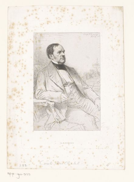 Frans Lauwers produced this print, titled 'Portret van Pierre Dens,' around the late 19th century. It presents a compelling glimpse into the social and intellectual circles of Belgium at that time. Consider the image: a man, likely of some social standing, is captured in a moment of contemplation. The details in the rendering of his face and hands suggest a life of both thought and labor. The print medium itself—a technology that allowed for the wide distribution of images—speaks to the growing importance of public figures and the desire to disseminate their likeness. Belgium in the late 1800s was a nation grappling with industrialization, class divisions, and burgeoning nationalist sentiments. Further research into the sitter and artist might reveal connections to specific social, political or artistic movements. Knowing more about them will enrich our understanding of the image and its cultural significance.