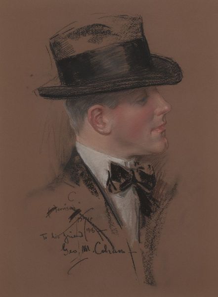 Editor: This is J.C. Leyendecker’s "Preliminary study, Cluett, Peabody & Co, Arrow collar advertisement," from around 1924, painted with acrylic. I’m struck by the smooth, almost porcelain-like skin of the figure; it's idealized, yet feels kind of unsettling, like a mask. What's your take? Curator: It's fascinating how you pinpoint that unsettling feeling! Leyendecker was, in many ways, creating a hyper-masculine ideal for the consumer age. Consider the historical context: this was the era of burgeoning advertising and mass production. This "Arrow Collar Man" wasn't just selling detachable collars; he was selling an aspirational lifestyle, projecting an image of WASP male dominance and subtle class privilege. Editor: So the ad campaign was doing more than just selling collars? Curator: Precisely! It was normalizing a particular brand of masculinity deeply intertwined with societal power structures, which actively excluded anyone who did not fit that mold. Do you see the specific ways in which this image achieves that goal? Editor: Well, the model is so polished and confident. And the angle, looking slightly down… he appears in control, powerful. Curator: Exactly! And consider how that idealized image perpetuated harmful beauty standards and notions of success that privileged white, upper-class men. This wasn't just about selling a product, it was about reinforcing a social order. Can we think of some contemporary versions of that? Editor: Absolutely! So many modern advertisements still link products with exclusive lifestyles. It's interesting to see the roots of that here. Thanks! Curator: My pleasure. It’s vital to analyze these visual texts and recognize the cultural narratives they uphold.