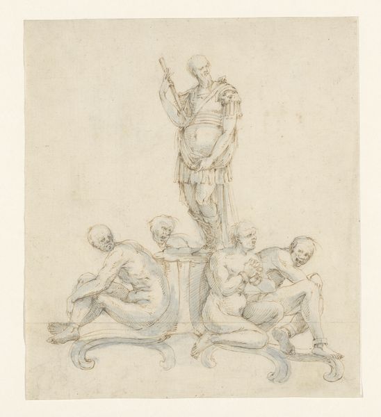 Curator: Look at this intriguing study, "Design for a Frieze," from around the 18th century. It's currently housed here at The Met. Created with pencil on paper, it presents an allegory in the classical-realist style. What catches your eye? Editor: Well, initially, it strikes me as…dreamlike. Ethereal. The figures seem to float, caught between form and the absence of it. Makes me want to touch it, see if my fingers go right through! There’s something fragile, yet monumental, about that paradox. Curator: That tension between fragility and monumentality speaks to the function of such a drawing. Architectural friezes were significant signifiers of status, intended to convey messages about the patron’s power and taste through historical or allegorical references. Editor: It’s funny, knowing that makes me feel a bit…restricted. Like I should decode it rather than feel it. But those soft, almost indistinct lines…they still whisper of something more human. The weight of the adult figure contrasted with the playful, nearly weightless cupid, and another toddler. What do you think? Curator: Precisely. Academic art of this period utilized such allegories to create layers of meaning accessible to those familiar with classical literature and mythology, to reinforce particular narratives about social structures or moral virtues for public consumption. Editor: Hmm, I keep coming back to the medium. Just pencil on paper! So unassuming. Knowing the frieze, if it was built, would've been massive. I find that contrast very potent, don’t you think? It’s like the drawing holds the potential for something huge, hiding within a fragile shell. The hand sketching and the end construction were so different. Curator: And it reveals the role of drawings in the artistic process during that era. They served as crucial preparatory tools—as a conduit between the artist's initial vision and the final, often grand, manifestation of that vision. Editor: So, more than just planning and getting approval. It’s a conversation on a whole different plane...between intention and what exists, right there in pencil. Curator: Precisely, and viewed through a social and art-historical lens, "Design for a Frieze" offers a rich opportunity to appreciate that conversation within the broader contexts of power, patronage, and the politics of visual representation during its time. Editor: Well, you've definitely given me a whole other perspective to see it through! Maybe there's no contradiction; instead, the key is just accepting that multiplicity of expression.