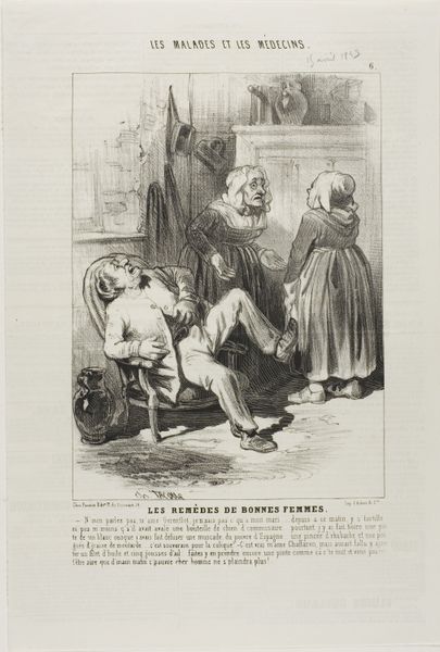 Curator: "The Oculist," plate 18 of Charles Jacque's series "Les Malades et les Médecins," produced in 1843, presents us with a lithograph now held at The Art Institute of Chicago. Editor: First thought? It’s delightfully dreadful. The scraggly lines and exaggerated features feel almost macabre, but with a definite wink. I feel like I’m peeking in on a shady deal in a Dickens novel. Curator: Indeed, the caricature is a prevalent theme here. It’s interesting to consider Jacque's intent within the context of 19th-century French society. These were times rife with skepticism towards the medical profession and the rise of quackery. Prints like this circulated widely, shaping public opinion. Editor: Absolutely! And that adds a layer, doesn’t it? This isn't just about two funny-looking dudes; it's a commentary. The supposed "oculist" looks like he’d be better off as a scarecrow. It’s humor, sure, but humor laced with social critique. Do you think people really believed in this kind of “instant cure”? Curator: Probably some did. The print's strength lies in exposing the gullibility that often accompanied desperation for cures, legitimate or not. But that oversized eye perched precariously above? Reminds me a bit of symbolist art to come decades later... Editor: You know, looking closer, that "eye" looks more like some alien sea creature gasping for air. Its got a creepy undercurrent running below the surface—I wouldn't trust that doctor as far as I can throw him. It is very evocative. Curator: Exactly! Jacque masterfully uses the graphic art medium to provoke and entertain. By making the flaws so glaringly obvious, Jacque subtly encouraged a critical, perhaps even cautious, stance towards those promising easy fixes. Editor: I hadn’t considered the intention to provoke wariness as much as just mockery, but that’s an interesting view on this lithograph’s function, for sure. Always a reminder of the layered meanings in even seemingly simple works. Thanks! Curator: My pleasure. Art offers infinite angles, each changing with perspective.