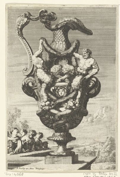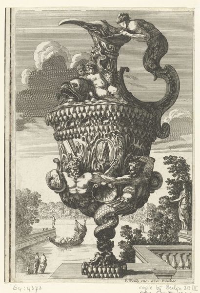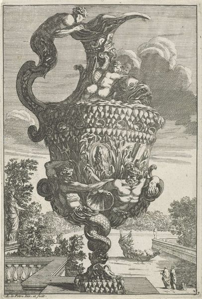 Editor: Here we have "Waterfontein op dolfijnvormige poten," a print by Jean Lepautre dating from about 1655 to 1678, currently housed at the Rijksmuseum. It feels like such an opulent, almost theatrical piece. The fountain itself is incredibly ornate, and the landscape behind it makes me wonder: How do you interpret the way Lepautre combines this sort of grandeur with the naturalistic setting? Curator: Ah, that's a juicy question! For me, the allure here is in the tension—the delicious, almost absurd contrast between the ultra-refined artifice of the fountain and the serene vista beyond. It's like, is this a landscape being 'conquered' by decorative excess, or is the fountain itself somehow softened, grounded, by the natural world peeking through? I like to think about the context too: 17th-century garden design often aimed to showcase mastery over nature, wouldn’t you agree? Editor: I can definitely see that in the framing—it feels very intentional in its artifice. Like we’re meant to be looking at nature, but only through the lens of artistry. Curator: Precisely! And notice those lounging figures at the base? They bring a whole mythological, almost dreamlike quality. Lepautre isn't just showing us a fountain, he's inviting us into a fantasy—a space where the artificial and the natural mingle, challenge, and ultimately enhance each other. Don’t you think it's also somewhat satirical, almost poking fun at such extravagant displays? Editor: Hmm, I hadn’t considered satire, but I see what you mean. Maybe it's both celebratory and a little bit tongue-in-cheek? Curator: Exactly! That's the fun, isn’t it? The work is layered with all the excessiveness from that period. It keeps shifting, like a glittering illusion, refusing to be pinned down to one single meaning. Editor: I guess it reflects our own position then – we’re invited into Lepautre's garden, to appreciate the complexity, but also question it, and perhaps smirk just a little.