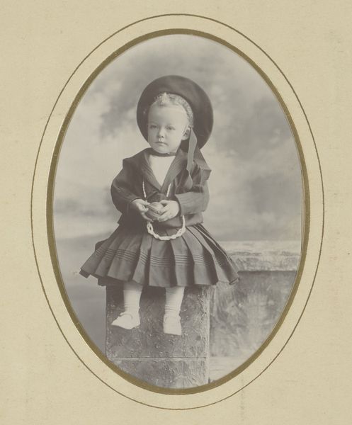 This photograph, "Portret van een peuter, staand bij een zuil," was created by Atélier Siewers and encapsulates the cultural and social values of portraiture in the late 19th or early 20th century. In that era, portrait studios flourished, democratizing image-making and providing access to visual representation for a wider segment of society. The child's formal attire and posed stance, leaning against a neo-classical pedestal, suggest aspirations of respectability and upward mobility. The "Atélier Siewers" likely catered to a middle-class clientele eager to emulate the visual language of the aristocracy. This small photograph reflects the prevailing social structures of its time, capturing both the desire for self-representation and the influence of social conventions on artistic production. To better understand this artwork, one could explore the history of photography studios, the evolution of portraiture conventions, and the social history of the Dutch middle class. The meaning of this photograph is embedded in its social and institutional context.