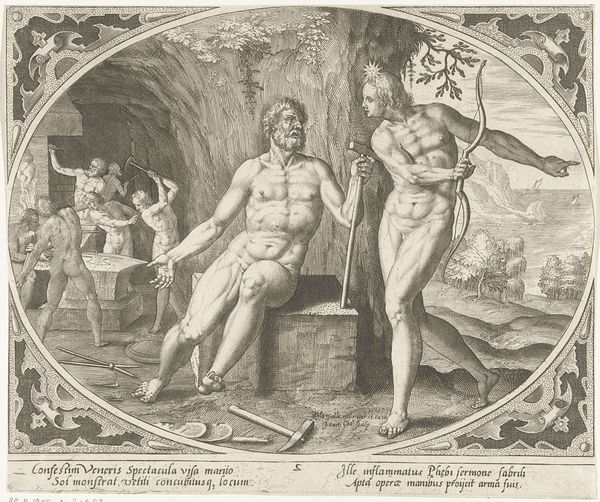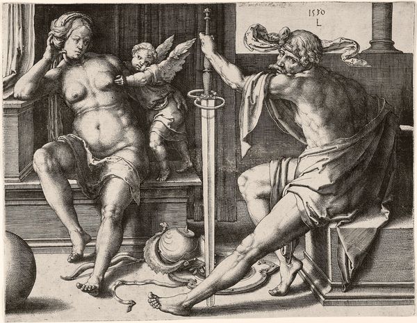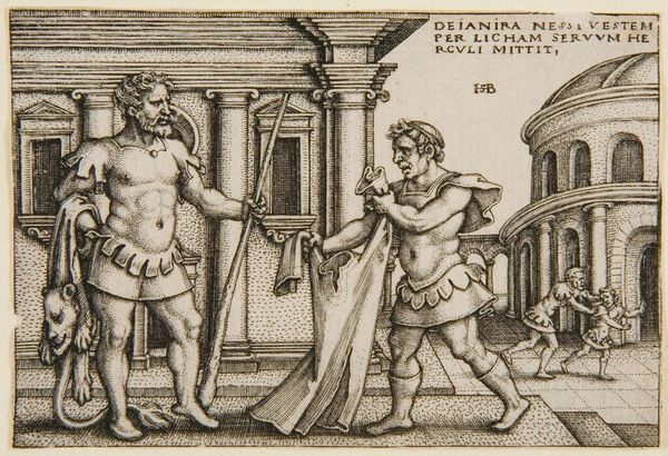 Sebald Beham’s engraving, 'Lycus Bringing the Garment of Nessus to Hercules,' is rendered with precise lines that create stark contrasts and a sense of contained drama. The composition is balanced, yet the tension between the figures of Lycus and Hercules introduces a dynamic unease. Beham masterfully uses line and form to highlight the narrative, drawing our eye to the unfolding tragedy. The texture of the garment, rendered through dense hatching, contrasts with the smoother surfaces of the figures' bodies, emphasizing its fateful significance. This play of texture and line activates a semiotic system where the garment becomes a signifier of deceit and impending doom. The architectural backdrop, meticulously detailed, frames the scene, but it does not overshadow the foreground action, thus creating a stage for human drama. The engraving's formal elements serve not just aesthetic ends, but also underline the artwork’s engagement with themes of deception, fate, and human suffering. Through the lens of formalism, we recognize how the artist’s command of line and composition effectively communicates a complex narrative with profound emotional depth.