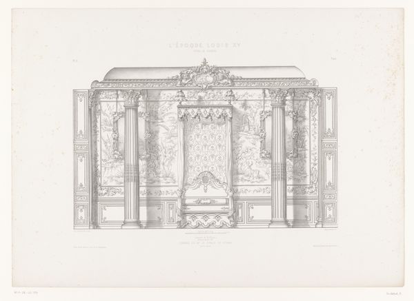 This engraving by Alphonse Guilletat depicts the wall in the princess of Rohan’s room in Hôtel de Soubise, presenting the height of Louis XV style. Notice the intricate details of the room's design, brought to life through the skilled use of engraving techniques. This method, involving carving into a metal plate to hold ink, mirrors the meticulous labor of the artisans who originally crafted the room's ornate decorations. The profusion of gilded carving celebrates the wealth and power of the aristocracy, while also hinting at the huge amount of labor required to produce it. Consider the social context of the Hôtel de Soubise, a site of political power and social spectacle. The room’s design emphasizes both privacy and display, showing the contradictions inherent in courtly life. The emphasis on ornamentation – repeated in patterns of carving, plasterwork, and textiles – speaks to a culture of conspicuous consumption. Engravings like this were not just documentation but also circulated taste, influencing design trends across Europe. By focusing on the materiality and making of this room, we gain insight into the society and aesthetics of the time.