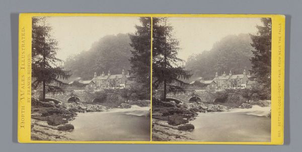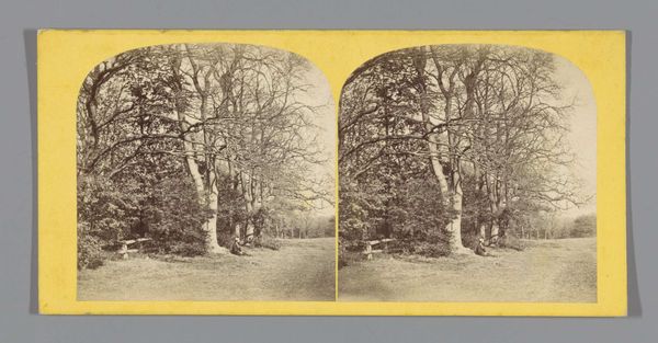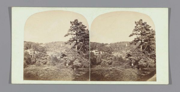 Curator: The reflective stillness of the water really sets the mood here. What do you think? Editor: It's beautifully melancholy. I'm drawn to the way the albumen print medium lends this piece, entitled “Gezicht op bomen langs Grasmere,” its depth of sepia tones. Produced circa 1850 to 1880 by Helmut Petschler, the print seems to whisper rather than shout. Curator: Albumen prints of this period were crucial for how landscapes became emotionally and spiritually relevant. They were the forerunners of accessible art consumption. Editor: True, the landscape genre really benefits from this method. The light hitting the tree foliage, mirroring its structure into the waters, creates a powerful, symmetrical visual architecture, but then it's broken and softened by the reflections. Curator: This imagery touches on deep-rooted cultural associations with nature's ability to mirror not only itself but our own souls. This prefigures later movements centered on nature as refuge from modern chaos. Water especially takes on the meaning of mediation. Editor: Right, this monochrome choice pushes our focus onto the compositional components. There's that horizontal emphasis formed by the riverbank that divides the photograph and then the vertical thrust upwards to the trees. Curator: Trees, like water, bear symbolic significance. Think of the Tree of Life – it visually represents life’s interconnectedness and how we continue to aspire upwards, towards enlightenment or divine knowledge. In its simplicity, it provides access to very complicated emotional realms, longing and grief and connection to something larger than oneself. Editor: These formal decisions communicate that feeling so clearly! Helmut Petschler truly creates an environment both grand and incredibly intimate, which resonates through the delicate textures in the image. Curator: Indeed, this photograph speaks volumes about the silent dialogue between humans and the landscapes we project ourselves upon. Editor: I agree. A thoughtful experience of formal and informal elements working beautifully together!