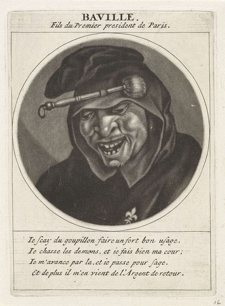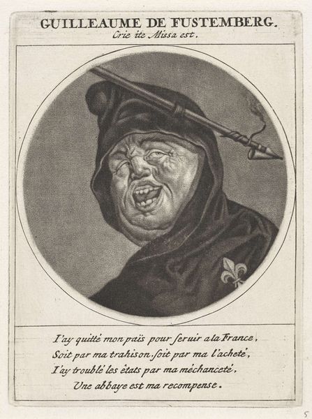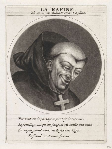 Editor: This is "Portret van Guillaume de La Brunetière," an engraving by Jacob Gole, created around 1691. It's… intense! The cross askew on his head and that knowing smirk, it feels like it's trying to say something biting about religious authority. What do you see in this piece? Curator: Oh, absolutely. The visual language screams satire. Think about the symbols used here: the Bishop's garb, the misplaced crucifix – a potent symbol subverted! It's like Gole is tapping into a collective unease about power and piety. The caricature plays on that tension, doesn't it? Editor: It does. The face is so exaggerated, it’s almost grotesque. Was that a common visual strategy at the time? Curator: Indeed. Caricature offered artists a way to critique social figures and institutions, like the Church, using humour to bypass censorship. Look at the lines of the engraving, the deliberate distortions… it all adds up to a dismantling of respect. The figure, along with the printed text below the portrait which begins with the words "If I carry the cross with passion..." is basically admitting hypocrisy and putting profit above devotion. Editor: So the subverted religious imagery and biting visual language become a form of protest? Curator: Precisely! The artist uses symbols not just to depict, but to actively *undermine* the authority that they represent. By mocking conventional symbols and twisting their meanings, it challenges viewers to question what those figures represent, both then and perhaps even now. Editor: It's incredible how much meaning can be packed into such a small image. I will never see religious symbology the same way. Curator: And I hope, appreciate the visual shorthand through the distortion of this one!