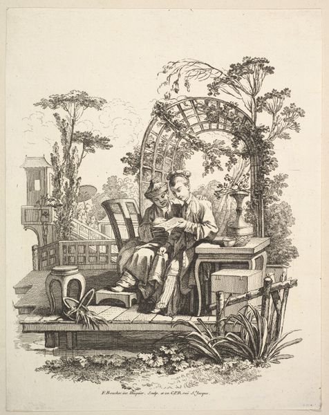 Curator: Gabriel Huquier created this delicate etching, pen sketch, and ink drawing called "Flautist and a Child Timpanist" sometime between 1737 and 1747. It's currently held here at the Metropolitan Museum of Art. Editor: Well, my first impression is how light and airy the composition feels, despite the precision of the lines. It almost gives the sense of music visualized, like a score brought to life. Curator: That’s quite perceptive. If we analyze it through a Formalist lens, we can observe how the lines contribute to a sense of balance despite the asymmetry. Note the strategic placement of the pagoda in the distance with its orienting lines and shadows compared to the table's and platform's edge. Editor: Indeed! Beyond the mere placement of structural lines is the iconography of childhood. Musical instruments in the hands of children… it evokes a powerful symbolism of innocence, creation, and play. Even that oversized flower is there as a sign of virility and fecundity, and an echo of human immaturity and playfulness in general. Curator: Intriguing reading of those signs. From my perspective, though, the texture created by the hatching and cross-hatching lends significant depth. There is no clear perspective or orthogonality to lean into. Consider, too, how the birds scattered across the foreground, each etched with subtle differences, establish the spatial relations between objects, and thus between figures and landscape. Editor: Right. Consider the larger tradition too of European "chinoiserie", the interpretation of idealized east asian artistic traditions… How might that informed vision affect our interpretations of this seemingly straightforward piece today, versus then? Curator: Undoubtedly that interpretive mode introduces nuance into the meaning! Editor: So, ultimately, it’s a piece that resonates not just for its intrinsic qualities, but for what it tells us about the exchange of visual culture across continents. Curator: Yes. A valuable case study in artistic influence and form meeting interpretation, as demonstrated within the balance and imbalance we've discussed, if I may conclude in sum.