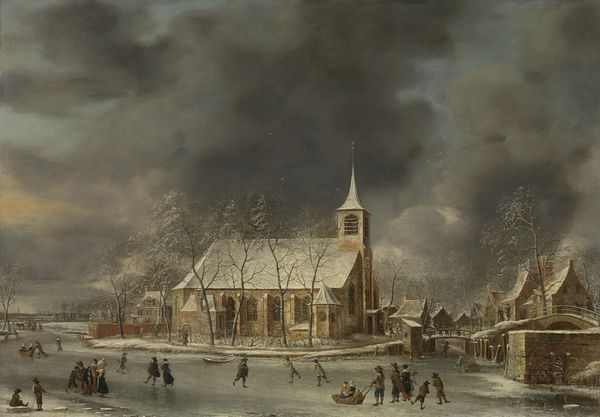 Editor: We’re looking at “Dorfstrasse Im Winter Mit Tränke” – translated, Village Street in Winter with Watering Place - an oil painting by Heinrich Bürkel. It's a captivating snowy scene. The labor seems arduous, and the environment, quite stark. What stands out to you about this piece? Curator: Let's consider the materiality here. Bürkel, using oil paint, meticulously depicts the textures of snow, wood, and the horse's coat. Note how the layering of the paint mimics the build-up of snow on the rooftops and along the road. The very act of painting, of representing the cold through this medium, elevates the daily work of a rural existence. The tools being employed, water source, the transport of labor, its depiction asks how Romanticism viewed labor. Editor: That’s a great point about the layered paint reflecting the layers of snow. Does that suggest a particular relationship with realism for you? Curator: Precisely. The *realism* here isn’t just about mimicking the scene, but highlighting the working person. Bürkel’s skillful application calls attention to that which might have been dismissed or not deemed suitable for representation at the time. How does one transform daily labor and production into the sphere of "high art?" He immortalizes an environment, a location by turning daily rural life into a type of art. The context is everyday rural life in Bavaria. Editor: So the labor and everyday aspects elevate the landscape itself? Curator: Exactly! By emphasizing the labor within the landscape, Bürkel makes a statement about the dignity of rural existence. It bridges the gap between idealized landscapes and the realities of daily work. Editor: This gives me a completely new way of appreciating not only the painting but its significance! I am interested to look at more of Bürkel’s paintings now and analyze his materials further. Curator: Indeed. Keep examining art, and keep these material and social elements at the front. The world becomes ever-more vivid when examined from that perspective.