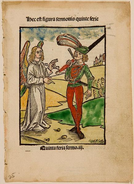 Editor: This is "The Angel Warns the Prodigal," a woodcut illustration from around 1495. It's fascinating! What strikes me is the tension between the angel's earnest plea and the prodigal's defiant stance. How do you interpret the social dynamics at play here? Curator: It's crucial to consider the historical context. This image reflects anxieties about social mobility and the moral corruption associated with urban life. The prodigal's fashionable attire signals a rejection of traditional values and the communal bonds of the family. Do you see how the angel is positioned outside the architecture? Editor: Yes, it's as if the angel represents an external moral authority trying to break through. Curator: Precisely. This image invites us to examine how power operates through moral discourse and how individuals navigate social expectations. Consider the implications of wealth in relation to salvation during this era. Editor: That’s a new perspective! The illustration becomes less about personal failing and more about societal pressures. Curator: Exactly! And considering that, we may discover further social and cultural tensions.