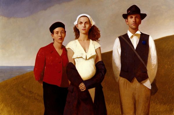 Editor: So, this is Bo Bartlett’s “Au Matin,” painted in 2006. It’s a really striking image—those figures are so somber, and the setting feels both like a dream and a stage. What do you see in this piece? Curator: The symbols, the dreamlike state - they resonate deeply. Observe how the woman is positioned—her vulnerability is underscored by the almost clinical attire and the restraining arms. The two men, like archetypes of authority, flank her. They evoke an old, enduring societal dynamic, perhaps about control, or even protection...What does that stark doorway suggest to you? Editor: A portal? Maybe escape? I'm drawn to the wave on the left – it feels so untamed compared to the rest. Curator: Precisely! That wave, juxtaposed with the geometric doorway, creates a visual tension. Consider how water often symbolizes the subconscious. The artist may be alluding to the struggle between our inner, primal selves and imposed order. This struggle plays out through these cultural symbols, it's an image our collective memories understand. Editor: That makes sense. The figures are also turned away, so the viewer is made a participant, but somehow disconnected from the figures. Curator: Indeed! That distancing contributes to the universal quality of the piece. The figures, by being anonymous, ask us to reflect on the archetypes they embody within ourselves and in society. It’s about cultural memory repeating itself. Does the title, "Au Matin", now seem to hint at a new beginning fraught with familiar struggles? Editor: It really does. I didn’t see all of those layers before. Thank you; I’m going to be thinking about this for a while. Curator: And that’s the power of imagery, isn’t it? It continues to resonate and transform over time, echoing through our own experiences and understanding.