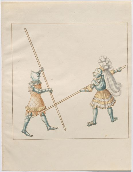 Curator: Here we have "Foot Combat with Longswords and Buckler Shields," a watercolor and coloured pencil drawing, made circa 1512-1515, by an anonymous artist. Editor: It strikes me as playful, almost whimsical, despite depicting combat. The light washes of colour and delicate lines give it an airy quality. Curator: The lightness you perceive contrasts sharply with the violence portrayed. This was a period steeped in codes of chivalry, so this drawing could represent the performance of courtly ideals through ritualized combat. Notice the carefully rendered attire of the fighters. Editor: Indeed. The geometric patterns and vibrant contrasts on their tunics certainly command the eye. Structurally, the composition is quite simple: two figures, symmetrically opposed, rendered in clear, distinct lines. The limited colour palette contributes to this directness. Curator: That directness makes the figures immediately legible, and allows them to serve as archetypes. The drawing likely functioned as part of a larger symbolic system of aristocratic power, drawing on deeply entrenched notions of honor, strength, and lineage. The combat is symbolic, reinforcing those codes. Editor: Interesting that the artist employs a style that’s seemingly flattened. There's minimal depth, which emphasizes the decorative, rather than illusionistic qualities of the image. Curator: Think about that flatness as serving an instructional function. The postures of combat are very clear. Consider the use of similar images for military manuals or heraldic devices: legibility and replicability are key, supporting widespread cultural messaging. Editor: Looking at the piece formally, that flat perspective creates an almost diagrammatic clarity that perhaps enhances its readability more than its artistry. Curator: It becomes a distilled image of the medieval, embodying strength, pageantry, and structured power. I'm seeing so much revealed in just these few simple colours. Editor: And I’m struck by how powerfully those simple visual decisions contribute to its unique visual language, a real intersection of material and medieval performance!
