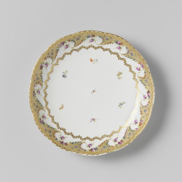 Editor: Let's take a look at this “Saucer with floral scrolls and flower sprays”, a porcelain piece crafted around 1775-1790 by Clignancourt. The delicate floral painting is just so precious and sweet. I can't help but wonder... What story do you think this little dish whispers to us? Curator: Oh, it’s a flirty whisper, don't you think? The porcelain itself is so very refined and screams for luxurious parties! The sprays are almost like the flitting glances shared over cups of steaming chocolate or tea during witty exchanges and gossiping. Note the asymmetrical balance... the wabi-sabi attitude toward what's perfection in painting, an intentional departure, perhaps reflecting a rebellion, from what were considered stuffy Rococo-era motifs! Editor: I never thought about it as flirty before! I saw delicate, but you're right, there's a bit of coquetry, especially in how the golden rim emphasizes its small size. Do you think people really paid attention to the asymmetry in a daily object like this? Curator: Probably not consciously, but one never knows how deeply such seemingly minute things work at you at all the different levels of awareness, consciously or unconsciously. Now I am suddenly seeing these blossoms as the sweet sentiments of the era... and the painter definitely had an eye for balance and proportion, playing against a purely calculated kind of arrangement. Makes you wonder, what kind of hands used it, don't you think? What stories of secret liaisons might it tell if it could talk? Editor: Absolutely! Imagining it being held and used gives it so much more life than just viewing it as an object. I’ll never see porcelain quite the same way. Thanks! Curator: My pleasure! And the most glorious thing, isn't it, that a single object is an entire universe!