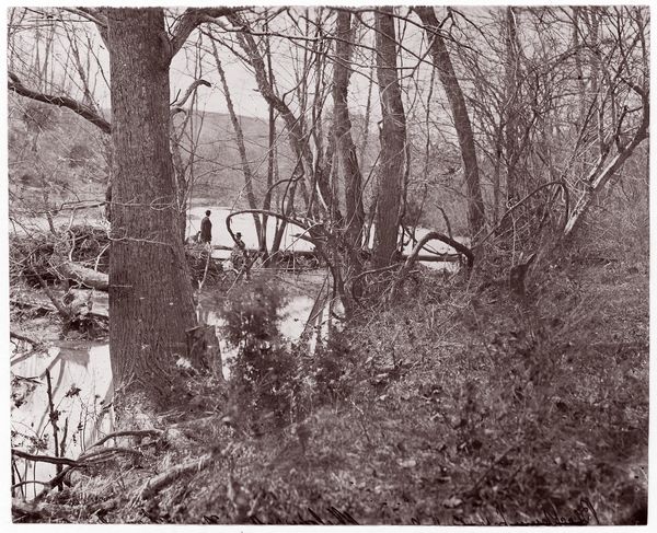 Editor: This photographic print by Lucian and Mary Brown, called "Untitled (patio and trees behind house)," looks like a ghostly memory due to its monochromatic palette. What symbols do you find resonate strongly here? Curator: The patio becomes a stage, doesn't it? The statuettes flanking the steps, almost like silent witnesses, echo ancient guardian figures, suggesting a liminal space between the domestic and the wild. The trees, like skeletal fingers, reach skyward, hinting at mortality and the passage of time. What emotions do these visual cues evoke in you? Editor: A sense of stillness, like a paused moment just before dusk. I never considered the statuettes as guardians, but it changes my perception. Curator: The inverted tones emphasize the symbolic weight. Think about how light and shadow are traditionally used; reversing them disrupts our expectations and makes us question what is real, what is remembered. Editor: So the emotional impact comes from both the composition and the unsettling reversal of light and dark? Curator: Precisely! It pulls us into a dialogue with memory itself. Editor: I'll definitely look at photographs differently now.