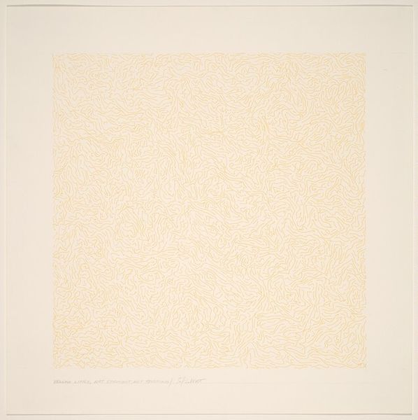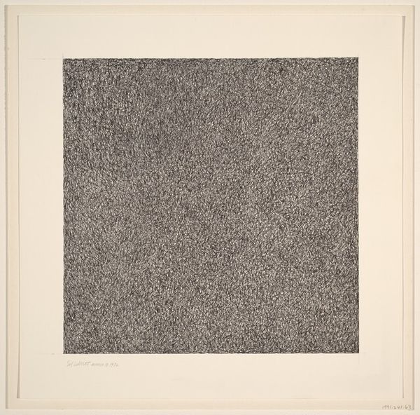 Curator: Richard Lutzke’s "Noise," a work from 1980 rendered in graphite and linocut print on paper, presents a densely packed field of geometric and organic patterns. It really makes you want to stop and take it all in. Editor: Absolutely. My initial impression is one of contained chaos. The visual texture is intense, almost overwhelming, yet the square format provides a structured boundary, containing the "noise," as the title suggests. Curator: The title "Noise" seems quite fitting. To me, this composition resonates with a sense of overwhelming information, akin to the information overload we experience daily in our modern world. The symbols, although abstract, evoke the scattered fragments of memory and data that constantly bombard us. Editor: I'm fascinated by the use of line and form. Look at how the linocut technique renders these small, precise black shapes, almost like musical notation scattered across a page. Do you think the "noise" is meant to represent a visual symphony, a dissonant composition perhaps? Curator: The resemblance to scattered notes of music definitely springs to mind! And if that is true, this may point toward a deliberate cultural commentary on the dissonance within art or music itself. This era saw increasing experimentation, which challenged established forms and harmonies. Editor: Agreed. Considering that, the tension between the rigidity of the linocut and the organic nature of the overall pattern becomes quite pronounced, creating a visual paradox. The surface quality, too, speaks to a tactile process, inviting a haptic engagement beyond mere sight. Curator: In essence, the geometric elements combined with organic flows conjure the idea of human attempts to create meaning from chaos. Editor: And as such, it's successful! From my point of view, Lutzke offers not merely noise, but structured noise – a complex interplay of visual rhythms and dissonances. Curator: For me, the piece reflects that continuous, inevitable integration of external clamor with internal reflection. Thanks for joining me. Editor: Thank you, it was most insightful.