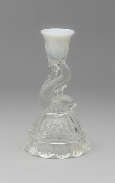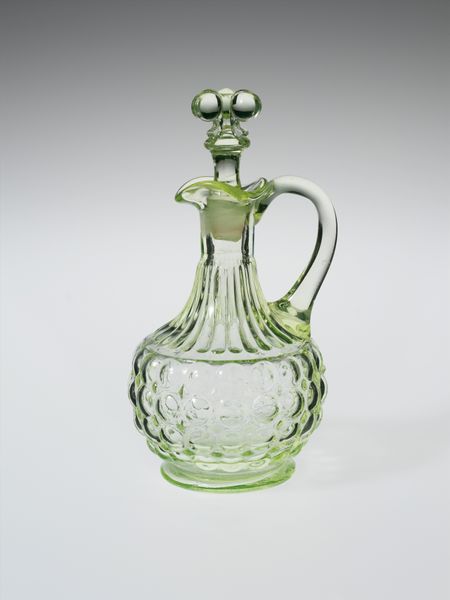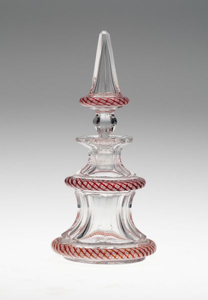 Here we have a stoppered decanter made from clear glass by an anonymous artist. The eye is immediately drawn to its symmetrical design, which has a bulbous base narrowing to a slender neck, topped with an ornate stopper. The glass is meticulously cut to create vertical lines and facets that play with light and shadow. The form of the decanter speaks to a functional elegance, yet the craftsmanship elevates it beyond mere utility. Consider how the clarity of the glass allows for a direct engagement with its contents, hinting at the sensuous experience of pouring and serving. The refraction of light through the glass adds an ephemeral quality, transforming the decanter into a dynamic, almost performative object. Notice how the artist has used the material properties of glass to create both structure and ornament. This interplay between form and function invites us to contemplate not just what the decanter holds, but how it shapes our perception and enjoyment of it.