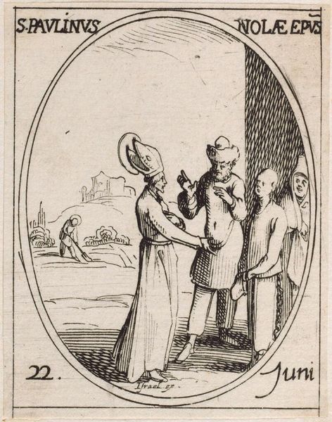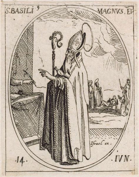 Editor: This is Jacques Callot's "Saint Victor," an etching. It feels incredibly theatrical, with a stark contrast between the violence and the saint's serenity. How does the context of its creation inform this depiction of martyrdom? Curator: Callot's work often reflects the socio-political turbulence of his time. This print, likely part of a series, should be viewed within the context of religious conflicts and power dynamics. Martyrdom wasn't just a historical event; it was a potent symbol, strategically deployed to solidify faith and justify resistance. What does this image say about power? Editor: It's interesting how it frames power as both divine and brutal, with Saint Victor as a figure caught between them. Curator: Exactly! And that tension is key to understanding how these images functioned within the broader narrative of religious and political struggle. Seeing it this way brings a new perspective.