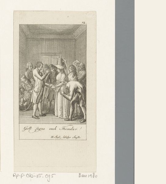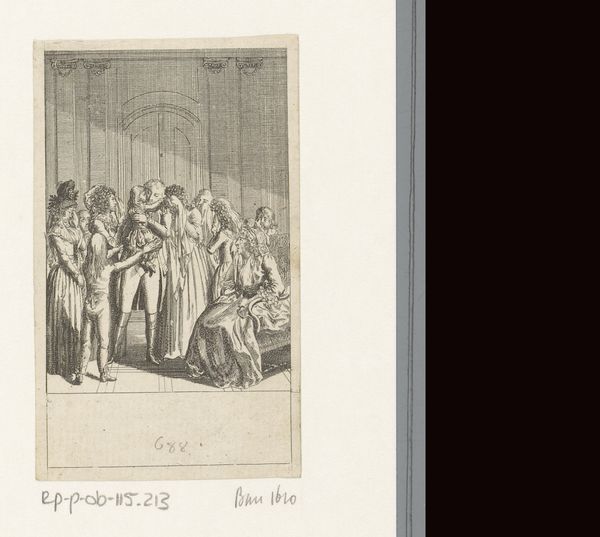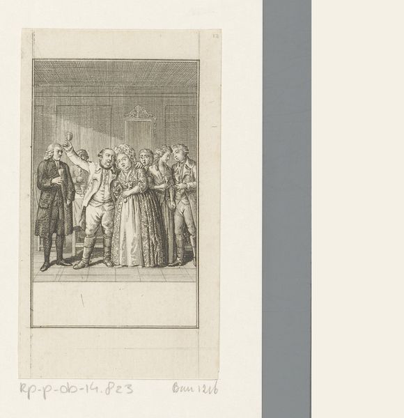Daniel Nikolaus Chodowiecki created this small etching, "Mannen en vrouwen in de rij voor Voltaire," which translates to "Men and women queueing for Voltaire," during a period of great intellectual ferment. During the 18th century, Enlightenment ideals were spreading across Europe, challenging traditional norms and advocating for reason and individualism. Here, we see a diverse group of people, distinguished by their varied attire and postures, waiting to meet Voltaire, one of the Enlightenment’s most influential figures. The scene captures a moment of cultural pilgrimage, where individuals from different walks of life seek enlightenment from a celebrated intellectual. Chodowiecki's work reflects a society in transition, grappling with new ideas about individual freedom, social justice, and the role of reason in human affairs. In its depiction of people seeking knowledge, the etching encapsulates the emotional and intellectual fervor of an era defined by its pursuit of enlightenment.