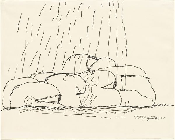 Editor: We’re looking at an untitled ink drawing of a female nude resting on her side, by Richard Diebenkorn, made sometime between 1955 and 1967. The bold, sweeping lines give it a real sense of immediacy, almost like a snapshot. What do you see in this piece? Curator: I'm drawn to the interplay of positive and negative space. Consider how the artist uses the white of the paper not merely as background, but as a structural element that defines the form itself. Notice how the contour lines, thick and dark, establish the figure's boundaries, yet also suggest volume through their modulation. Do you observe how the darker washes of ink pool in certain areas, creating a sense of depth? Editor: Yes, the way the ink pools definitely gives a feeling of shadow and dimension, especially around the torso. But how do you interpret the open areas with barely any line work? Curator: Those areas, where the form is implied rather than explicitly defined, invite the viewer to actively participate in the act of seeing. The artist challenges our perception by presenting a partial view, forcing us to complete the form in our minds. It speaks to the essence of drawing as a process of suggestion rather than precise replication. How does that incompleteness make you feel? Editor: It makes me consider the ephemeral nature of the moment, the idea of capturing something fleeting rather than something fixed. It's like the figure is still in motion, even in repose. Curator: Precisely. The strength of the work lies not just in its representational accuracy, but in the dynamic tension between what is shown and what is left unsaid. Editor: I see it now. By focusing on the interplay of lines and space, the drawing speaks volumes, even without minute details. Thank you! Curator: My pleasure. It's by considering the intrinsic qualities that we appreciate its enduring impact and unique qualities.