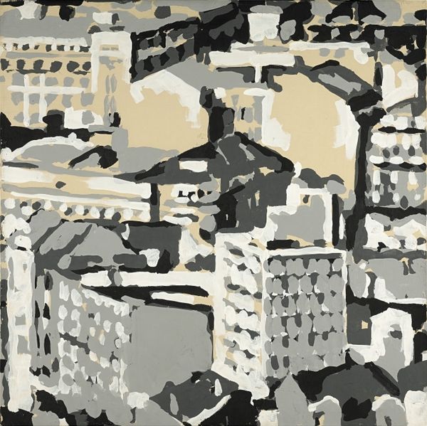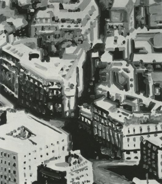 Editor: This is Gerhard Richter’s “Townscape F” from 1968. It looks like an aerial photograph that's been rendered in oil paint with heavy impasto, all in shades of gray. It feels chaotic but also... strangely organized. What do you see in this piece? Curator: Immediately, I'm drawn to the painting's structure. Notice how Richter employs a limited palette – the monochromatic scheme emphasizing the tonal relationships. The impasto technique is critical; how does its tactile quality contribute to the overall composition? Editor: I guess the texture does add a layer of complexity. It makes it less about just the image and more about the physical act of painting, right? Is that what makes it Abstract Expressionist? Curator: In part, yes. But observe closely: The dense network of brushstrokes obscures representational clarity. There’s a tension here: a striving toward representation battling against pure abstraction. Are we looking *at* something, or *at* paint itself? What purpose does this inherent tension achieve? Editor: I see what you mean. It’s not a clear cityscape, but there are definitely forms that suggest buildings and streets. Maybe that tension mirrors the experience of living in a city—the chaos and the order all at once? Curator: Precisely. Now, consider how the composition, lacking a central focal point, disperses the viewer’s attention across the entire surface. This dispersal, alongside the textural variance of the impasto, engages the viewer with questions concerning value: how we value painting versus photography, or abstraction and realism, in depicting our environment. Editor: So it's like Richter is using the act of painting to question our perception and understanding of… everything! It’s much more than just a cityscape. Curator: Precisely! He encourages us to investigate how we perceive both art and the urban landscapes that define our modern experience. Editor: I will never see another Gerhard Richter painting the same way. Thanks!