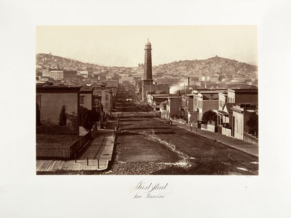 Curator: Here we have Carleton Watkins’ "The Golden Gate," an albumen print dating from 1868-1869, providing an elevated view of San Francisco's development. Editor: The immediate feeling is of burgeoning order rising out of…potential chaos? The grid of the streets versus the steep, untamed hills. It’s dynamic and slightly unsettling. Curator: That tension between settlement and landscape is a crucial theme of westward expansion in America, visually echoed here. The image evokes Manifest Destiny through the houses, like determined assertions stamped across the land, gazing out at a beckoning horizon. Editor: Yes, the photograph organizes everything into discrete zones. There's this regimented foreground, transitioning to the topographical variety of the slopes, and then the serene distance of water and sky. Each section offers a different texture. Curator: The albumen print gives it a rich sepia tone, doesn’t it? It’s the photographic language of memory for this period, lending the city a sense of instant antiquity even then. Each rooftop and street meticulously rendered. Editor: Precisely, it emphasizes structure. Even the fog, suggested in the background, almost takes on a solid form because of the tonal values. Curator: It almost hints at classical composition, that subtle use of receding space and light to create hierarchy, echoing centuries of landscape painting traditions even as it records an ostensibly "new" world. I find a dialogue there. Editor: For me, it emphasizes how photography creates meaning through its framing and the distribution of visual information. The linear perspectives are precise and direct, leading the eye deliberately across space. Curator: And looking at this through a contemporary lens, seeing how much this cityscape has changed is another layer entirely, layering on themes of progress, or loss, and shifting cultural meanings embedded within the symbol of 'The Golden Gate.' Editor: The details embedded invite deep visual mining and a critical decoding. Even mundane buildings create emotional reverberations by participating in these formal and visual structures. Curator: Agreed, what initially seems like documentary work is truly a meticulously arranged tableau, resonating with the weight of its historical moment and hinting at narratives yet to unfold. Editor: Looking again, I continue to discover formal echoes, a compelling interplay of organization and sprawl.