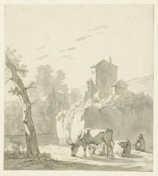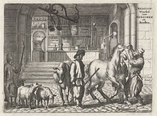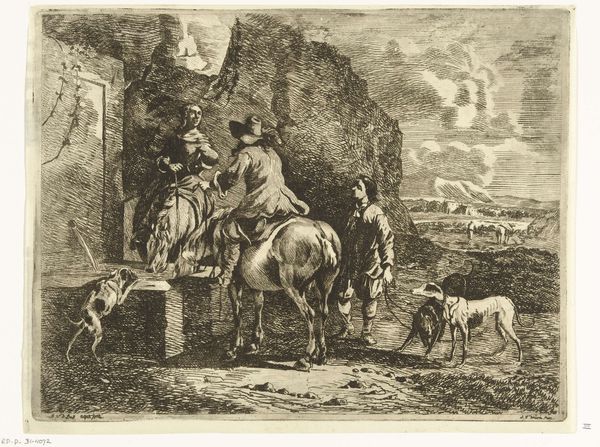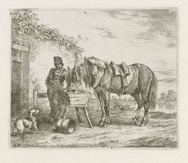 This is Gerard Hoet's etching, made sometime between 1648 and 1733, depicting a scene of a farrier at work. Here, the central motif is the horse itself, an animal laden with symbolic weight across millennia. Consider the horse as a symbol of power and nobility, tracing back to ancient Roman equestrian statues, where emperors asserted their dominion. Yet, here, the horse is subject to the farrier’s labor, a subjugation of power to necessity. This scene echoes in countless depictions of human-animal interaction—from the myth of Chiron, the wise centaur, to Dürer's engravings of horses, each bearing witness to the complex dance between humanity and nature. The gesture of the farrier—kneeling, touching, and tending to the horse's hoof—is also potent, evoking images of healing and care. Through time, this act evolves, appearing in Christian art as the healing touch of saints. In the collective memory, the horse becomes a conduit—a vessel through which humanity expresses both mastery and compassion. This interplay continues, resonating deep within our subconscious.
