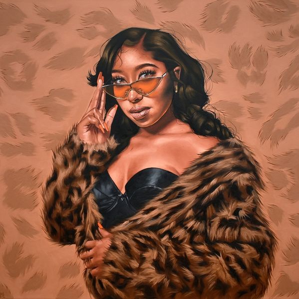 Monica Ikegwu made this portrait of Kelsey using oil on canvas. The limited colour palette creates a dreamy world that has you wondering if what you’re seeing is actually real. The dress looks soft and frilly, but the confident gaze of the figure suggests something deeper. Look at the way the ruffles are painted, the repetitive gesture of the brush creates a sense of movement and energy, transforming an everyday dress into something special. The linear element in the background adds a touch of abstraction, and the different shades of pink create a sense of depth, while also flattening the space. It reminds me a bit of Lynette Yiadom-Boakye, in the way that the figure emerges from the background. But Ikegwu’s focus on the details of the dress and the expression on the face give it a unique feel.