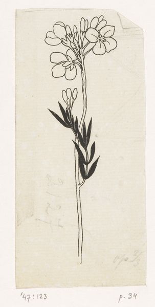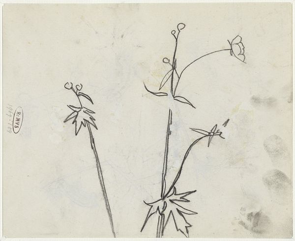 Curator: Welcome. We’re standing before Willem Wenckebach's "Clematis," a drawing created before 1893. It's held here at the Rijksmuseum, executed in ink, primarily employing line work. Editor: Immediately striking is the elegant simplicity, a study in contrasts. The stark black ink against the aged paper creates a delicate tension, almost as if the bloom is poised to detach from the plane. Curator: I appreciate how this clematis becomes a site to examine the complex relationship between nature and colonialism, particularly within botanical studies of the era. The very act of depicting flora often served colonial interests, documenting and cataloging resources within occupied lands. How might this drawing participate in such a tradition, even if subtly? Editor: From a purely aesthetic viewpoint, I'm intrigued by Wenckebach's restraint. The reduction to essential lines allows for an interplay of positive and negative space. It is the very economy of detail that accentuates the clematis' ethereal nature, no? There is almost an invitation to imagine what is not rendered—the colors, textures, and, of course, the plant's full context. Curator: Absolutely. And understanding Wenckebach's position in relation to broader scientific and social trends is key. The clematis could be seen as a symbol appropriated to uphold existing hierarchies. Botanical art frequently justified land exploitation under the guise of objective scientific inquiry. What ideological function, then, does this representation serve? Editor: Interesting questions, indeed. Looking closely at the composition, there is the contrasting density of the petals at the top to the stark, singular, heavy line that forms the stem, a dynamic leading the viewer's eye upward. The distribution creates a compelling rhythm, drawing the eye towards the light openness of the flower heads. Curator: Considering all that, this image underscores that any portrayal of the natural world is inescapably bound to its historical and socio-political context. Editor: A point well-taken and one that enriches my formal viewing of this composition, indeed. Thank you for guiding my perception toward the richer meanings inherent in what appears at first glance to be a simple study of nature.