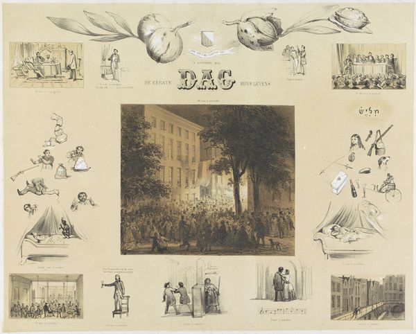 Curator: Here we have "Portret van Otto Gerhard Heldring en door hem opgerichte gestichten," dating from 1848 to 1863. Gerrit Jan Thieme created this work, a compelling example of 19th-century printmaking. It is composed as an engraving. Editor: It has an aura of somber self-importance. The symmetrical layout, the dark rendering of the portrait at its center, and surrounding landscapes evoke a sense of order and…patriarchal power. Curator: Power definitely factors in, thinking of the engraving process itself – the skilled labor and time involved in meticulously carving the image onto a metal plate. And the paper; its quality reflecting the economics of print production. The fact it's a print also means its was accessible for dissemination, so considering notions of accessibility, reproduction and craft is important here. Editor: Precisely. And the imagery too: Heldring, a central figure, is flanked by depictions of his charitable institutions. I’m interested in examining the cultural dynamics embedded in philanthropy during this period: notions of noblesse oblige, class disparities, and the role of institutions in shaping social behavior. Who benefits, who doesn’t? And how does this representation serve to legitimize a particular social order? Curator: Good points. And the landscape depictions also imply a kind of property ownership and control over space, framing him in terms of environmental and also economic power, by his dominion of land and assets. What were the circumstances and material conditions that enabled the construction and maintenance of those buildings? Editor: Exactly, let’s also contextualize Thieme himself, working within the academic art traditions of the time – think about his training, the aesthetic conventions that shape his hand. How much did this artist have agency and did it fit the criteria demanded in this academic form, how might this shape the artist’s hand? Curator: And ultimately, the end result – an easily reproducible image, one that serves as both a portrait and a symbolic advertisement for Heldring’s philanthropy and power and influence, given that engravings allowed for wider audiences. The mode of communication enabled through material process and choices has shaped my perception. Editor: So, an image that on the surface might appear as a simple portrait actually invites layered explorations into societal structure. Its interesting to consider that at this stage of print and artistic conventions its function isn't purely just to immortalize but actively advocate, too.