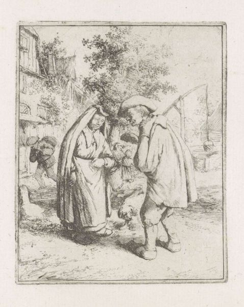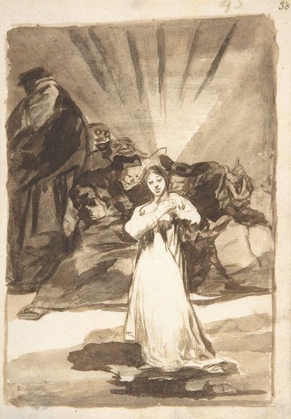 Editor: So here we have Goya's "Women and Children near a Cross", created somewhere between 1812 and 1820. It's an ink drawing, and it just strikes me as so bleak, but with a sort of defiant hope, maybe? What draws your eye when you look at this? Curator: Oh, isn’t it compelling? Immediately, I think about Goya’s mindset during the Peninsular War. The raw emotion he captures… that yearning for peace juxtaposed with the harsh reality of war. Does the positioning of the cross evoke, for you, both hope and a stark reminder of suffering? The almost ethereal quality, it's just amazing. What do you think of how he uses light and shadow to amplify the drama? Editor: Definitely a sense of drama. The faces, even in these simple lines, convey so much grief, and, as you said, hope. Do you think this was meant as a study for something larger, or is it a complete piece on its own? Curator: That's a wonderful question! Knowing Goya, this could very well be a study, yes. He was constantly sketching and experimenting. Yet, even if it's a preparatory work, it possesses a visceral power that stands alone, don't you agree? Perhaps, it’s that immediacy, that unfiltered expression of human emotion that resonates so strongly with us, regardless. Does this quickness of the piece make you consider its artistic value in a different light? Editor: Yes, absolutely. It feels so raw and immediate. I keep seeing new details! Curator: Precisely! I learn something new every time myself. It speaks volumes, doesn't it, about the enduring power of art to capture the human experience. Editor: Absolutely. Thanks for sharing your insights!