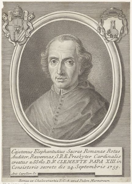 This is Jacob Houbraken's portrait of Christian Furchtegott Gellert, made with engraving. This piece, like many portraits of its time, captures the sitter's likeness, while subtly broadcasting his status and education. Houbraken, working in the 18th century, navigated a society of strict social hierarchies. Gellert, a prominent writer and professor, would have been part of a small, privileged class. The powdered wig, the delicate lace, and the formal pose all speak to this privilege. It's easy to see the influence of Enlightenment ideals in the precise lines of the engraving, reflecting a world that valued reason and order. The identity of the sitter becomes central here; this is less about emotional depth and more about public persona. Portraits like these served as a form of social currency. They helped solidify one's place in society and contributed to a visual record of the elite. The frame around Gellert’s likeness, adorned with foliage, further suggests Gellert's refined tastes. As you look at this image, consider what it tells us about who was deemed worthy of representation and how artists participated in shaping these perceptions.