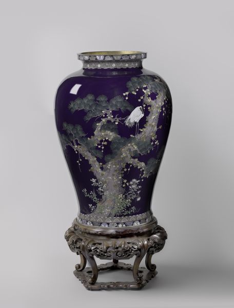 These two vases are decorated with naturalistically represented cranes and pine trees on a deep-blue ground. Both pine trees and cranes symbolise long life. The detailed rendering and sophisticated colour nuances illustrate the technical progress undergone by the cloisonné enamel process since the opening of Japan in 1854. Like Tokyo and Nagoya, Yokohama was a centre for the export of cloisonné enamel wares.