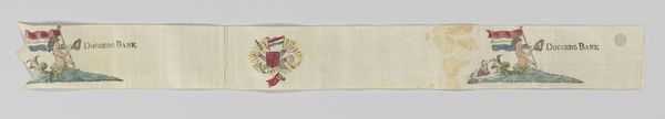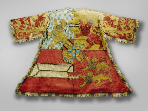 Editor: This is a funerary flag dating from 1767-1798, its author remains unknown. It's crafted from textile and adorned with bronze bands. There’s a solemnity to the piece. The dark fabric and heraldic emblem give it a formal and almost mournful quality. What strikes you about this object? Curator: That somberness, as you called it, resonates deeply when we consider the historical and socio-political implications of such objects. These weren't simply decorative items. What is visualized here is the visual language of power, privilege, and ultimately, remembrance within a specific historical context. This flag serves as a powerful symbol of the social hierarchy. Think about what this reveals about status, family lineage, and the values that society upheld. Does that change your initial reading? Editor: It does! Knowing that context shifts my understanding. The "mournful quality" is now laced with socio-political meaning. How would you connect the visual elements of this flag to that narrative? Curator: Look at the prominent heraldic emblem: The colors, the symbols… each element was carefully chosen to convey a message of lineage and authority. Consider how such displays reinforced social structures and hierarchies. This piece offers an entry point into exploring questions of inequality and representation. And how do we deal with these complicated histories today? Editor: I now view the flag less as an isolated art object, and more as a lens through which to examine broader socio-political themes of that period. Thank you. Curator: Absolutely. Recognizing art's capacity to expose power dynamics encourages us to actively deconstruct dominant narratives, not only in the 18th century but also those that influence society now.