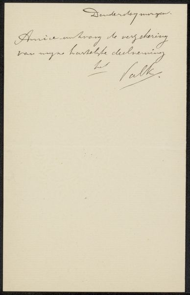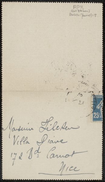 This "Brief aan Philip Zilcken" was made by Jeanne Erlich, likely with ink on paper in 1921. Right away, what hits me is the directness of the marks. They aren't trying to hide the process. The paper has a creamy, off-white color, and you can almost feel its texture. The dark ink creates a strong contrast, making the words jump out. The way Erlich writes, it's like each letter is a little gesture. Look at the loops in "Boulevard Carnot." They have this energy, like a dance. The letters vary in thickness, which makes it feel like the artist was really present, varying the pressure as she wrote. I love how the address is so specific, while the artist's intentions remain open. It reminds me a bit of Cy Twombly's work, where writing becomes drawing and meaning is layered and intuitive. "Brief aan Philip Zilcken" invites us to embrace ambiguity and find our own connections in the simple act of mark-making.