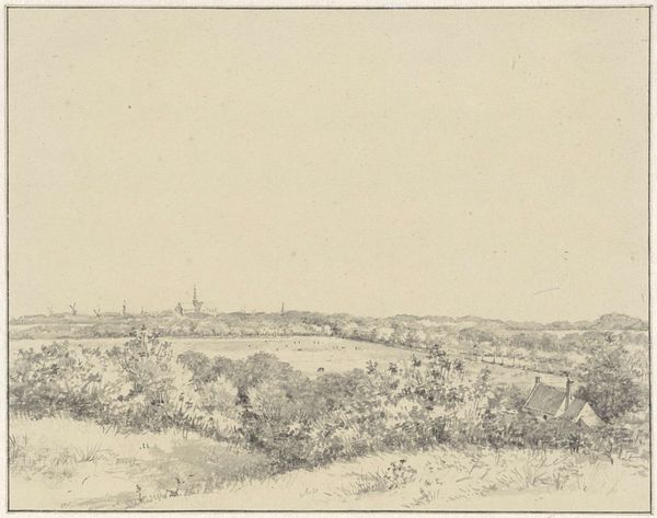Curator: Jan de Bisschop's "View of Haarlem from the Dunes," likely created between 1648 and 1671, offers a glimpse into the Dutch Golden Age landscape tradition. Executed in ink on paper, this drawing showcases a panoramic vista rendered with delicate lines. Editor: Ah, my first impression is pure tranquility. It’s one of those days where the sky feels enormous, and everything below is just breathing easy. It’s deceptively simple, you know? Like a visual exhale. Curator: Precisely. De Bisschop's work leverages the minimalist quality of ink to effectively create depth. Note how he segments the composition horizontally—the foreground dunes contrasted against the flat expanse of Haarlem in the distance. Editor: It almost feels staged, in the best way. Like a theater backdrop meticulously crafted for light and shadow. The way the tiny figures are placed gives such a human scale to all the grandness, doesn't it? Curator: Indeed, their presence serves as a compositional element that not only offers perspective but also implicates a contemporary observer's engagement with the landscape. It is a powerful method of inviting us to consider the spatial relationships embodied in this vista. Editor: It really makes me think about how our perspective shapes everything. These dunes, they seem so permanent, yet this ink, it's so fleeting, like a memory being caught on paper. There is something nostalgic here. Curator: It’s a poignant juxtaposition. Furthermore, the limited tonal range invites one to contemplate the subtle modulations achievable through simple lines. This imbues the work with sophisticated depth and atmospheric quality. Editor: It definitely highlights the poetry found in the mundane. Something so ordinary can be rendered extraordinary, if you simply catch the right light, the right mood... You’re transported, truly. Curator: Ultimately, “View of Haarlem from the Dunes” prompts us to consider how space, materiality, and composition work cohesively. It also challenges our presumptions regarding artistic mastery and aesthetic economy. Editor: And sometimes, just sometimes, simplicity whispers the loudest. Thanks for reminding me to just stop and breathe in a view, any view. You have provided another window, it really is beautiful.