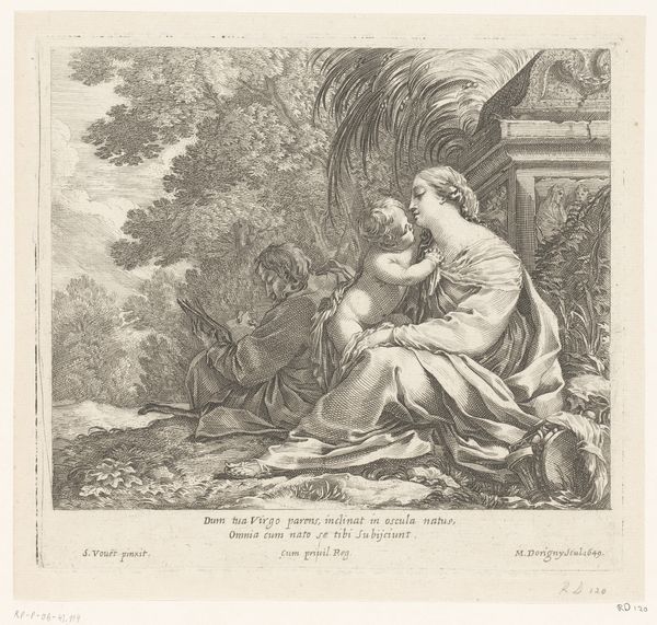 This chiaroscuro woodcut, “Maria met Kind en Johannes de Doper”, was created by Antonio da Trento in the first half of the 16th century. Trento, an Italian printmaker, lived during the High Renaissance, a time where religious subjects were often depicted. The artwork portrays Mary with the infant Jesus and John the Baptist, set within an oval frame filled with foliage. Mary, with her face in profile, delicately holds grapes, symbolizing abundance and the blood of Christ. Jesus and John are depicted as chubby infants, their closeness conveying innocence and divine connection. Trento's choice of the chiaroscuro technique, using contrasting light and shadow, adds depth and volume to the figures, highlighting the emotional and spiritual intensity of the scene. The faces of Mary and the children, despite their stillness, evoke feelings of love, protection, and destiny. The composition, while traditional in its religious subject, humanizes the figures, making them relatable and tender. The artwork invites reflection on the complex interplay of faith, motherhood, and sacrifice, resonating with viewers across time through its portrayal of intimate and profound connections.